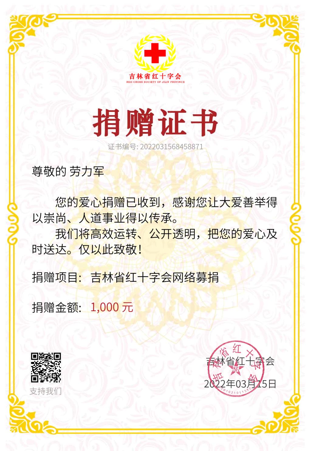 锦州医科大学附属第一医院民革党员劳力军博士心系受疫情困扰的群众,当吉林省爆发疫情时,他向吉林省红十字会捐款1000元。