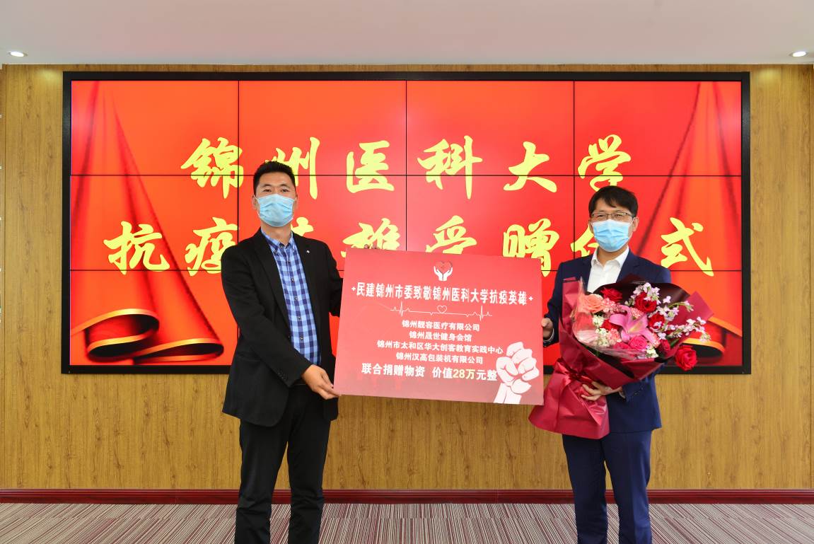 5月19日,我校举行了抗疫英雄受赠仪式,接受民建锦州市委捐赠的价值28万元物资。锦州市委常委、统战部长赵璟,市政协副主席、民建锦州市委主委康杰,民建锦州市委专职副主委樊志明,我校党委常委、副校长张丽娟,党委常委、统战部长郝慧生及附属第一医院、附属第三医院领导班子代表及相关成员代表出席仪式,受赠仪式由郝慧生主持。